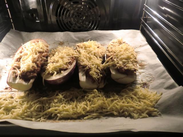 und dann in die Auberginen und mit Käse bestreut.