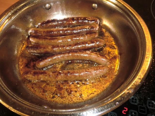 Ein paar habe ich in die Pfanne getan (da wird der Speck krosser), den Rest in den Ofen (gegrillt). Sobald der Speck schön braun ist, ist das Essen schon fertig. Haben noch ein paar Scheiben Vollkornbrot mit Olivenöl und Fleur de Sel geröstet dazu gegessen. Lecker!