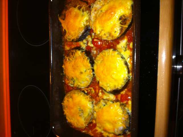 bei uns gibt es gleich überbackene Auberginen auf Tomatensauce.