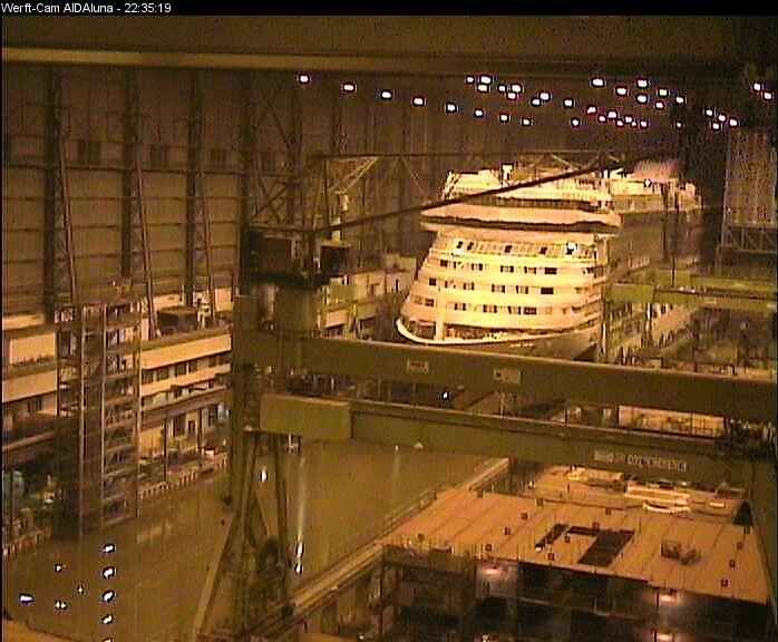 Schaut mal auf die Meyer-Werft Webcam, unser neues Baby hat seinen Schornstein bekommen.