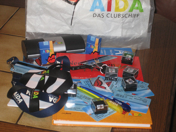 Ich kann gar nicht alles aufzählen - hier zu Hause habe ich schon fast eine komplette Aida-Ausrüstung. Meine schönsten Erinnerungen sind aber meine Geburtagsgeschenke: unterschiedliche Feuerzeuge, Briefbeschwerer, Liegetuch, Bademantel, Sweatjacke, Crewjacke und vor allem das: