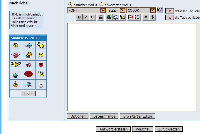 Nachdem ich auf Antwort erstellen geklickt habe, gehe ich dann auf ändern, dann sind dia Smilies zu sehen. Dann kannst Du sie einstellen.