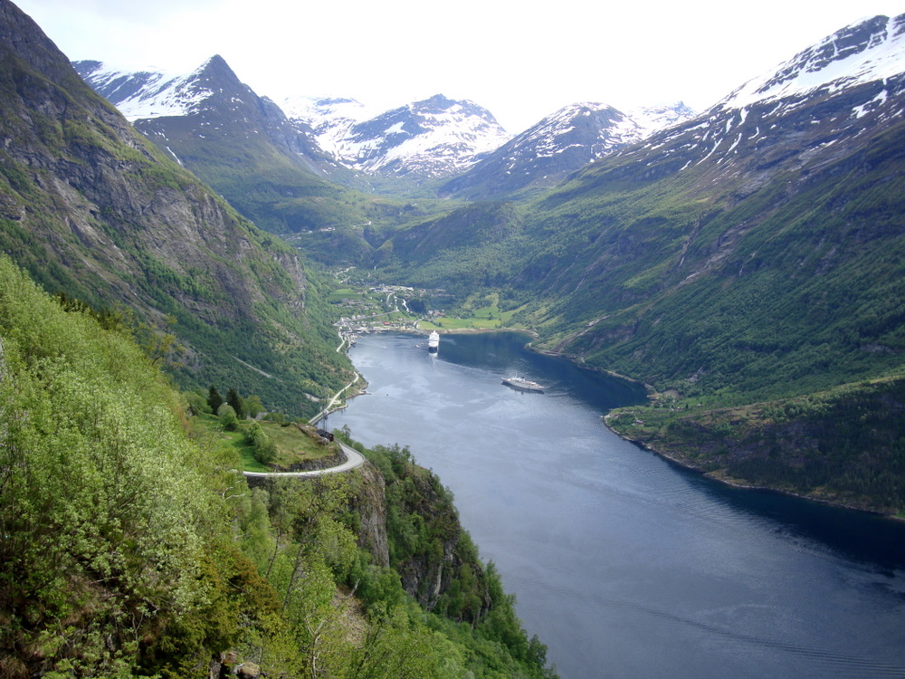 Der Blick vom Aussichtspunkt Flydalsjuvent und den Adlerkehren. Um 18 Uhr tenderten wir ein, dann hieß es um 20 Uhr Anker lichten nach Molde in 147 sm Entfernung.