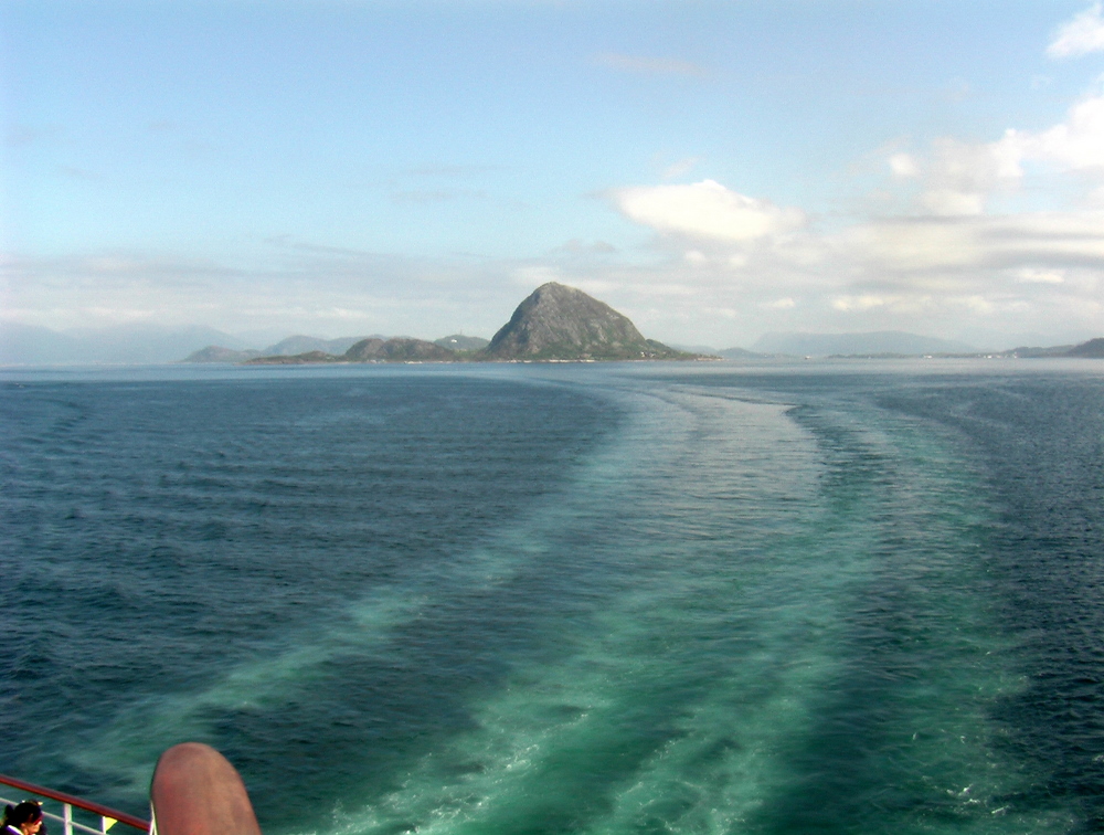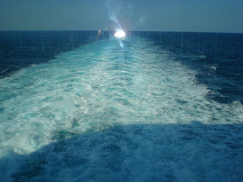 Es liegt nur am kalten Wasser aus der Tiefe, was beim Tiefgang von über 6 m nach achteraus gedrückt wird. Je kälter das Wasser, um so grüner ist die Farbe. Auf Nordlandfahrten sieht man das sehr schön.Da ist mir das blaue und warme Wasser der Karibik doch lieber.