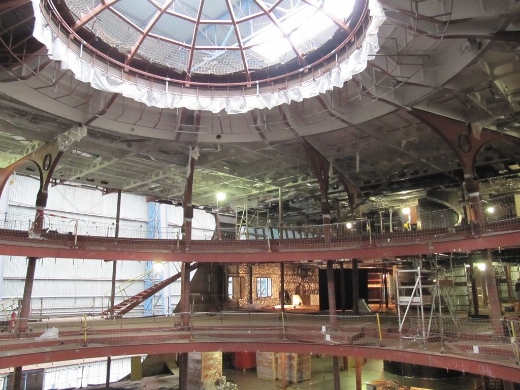 Hier unter der Kuppel, in schwindelerregender Höhe, werden Akrobaten des "> Showensembles in wenigen Monaten am Trapez ihre atemberaubenden Kunststücke darbieten. Während Artisten unter der gläsernen Kuppel fliegen, bewegen sich Tänzer und Gesangssolisten etwa 10 Meter weiter unten auf den Bühnen des Theatriums. Diese verändern sich wie von Geisterhand. Denn die Bühnen-Elemente sind alle hydraulisch versenkbar, mal fährt ein Piano nach oben, mal verschwinden drei Tänzerinnen nach unten.