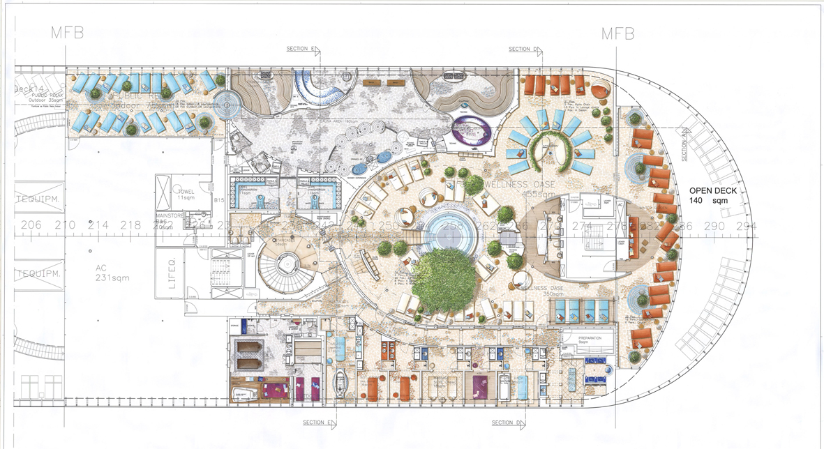Der mit 2.602 qm größte Fitness- und Wellnessbereich auf einem Kreuzfahrtschiff weltweit bietet seinen Besuchern ebenfalls mediterranes Flair. Wandmalereien in verschiedenen Blautönen auf weiß gestrichenen Wänden, klassische Skulpturen, dekorative Fliesenmosaiken, große Amphoren und kunstvoll drapierte Tücher vermitteln dem Besucher den Eindruck, als befände er sich auf einer griechischen Insel. In der als Insellandschaft gestalteten Wellness Oase mit angeschlossenem Wintergarten können Gäste unter einem sechs Meter hohen Olivenbaum die Seele baumeln lassen. Besonderer Clou: Das Dach des gläsernen Patios, das die Oase überspannt, kann bei schönem Wetter geöffnet werden. In 14 Kabinen verwöhnt das Spa Team die Gäste mit vielfältigen Wellnessanwendungen. Eine exklusive Wellness Suite mit eigener Sauna, beheizbarem Wasserbett, Whirlpool und separatem Balkon lädt zum individuellen Entspannen mit Meerblick ein. In der großzügigen Saunalandschaft, die sich durch große Panoramaschei