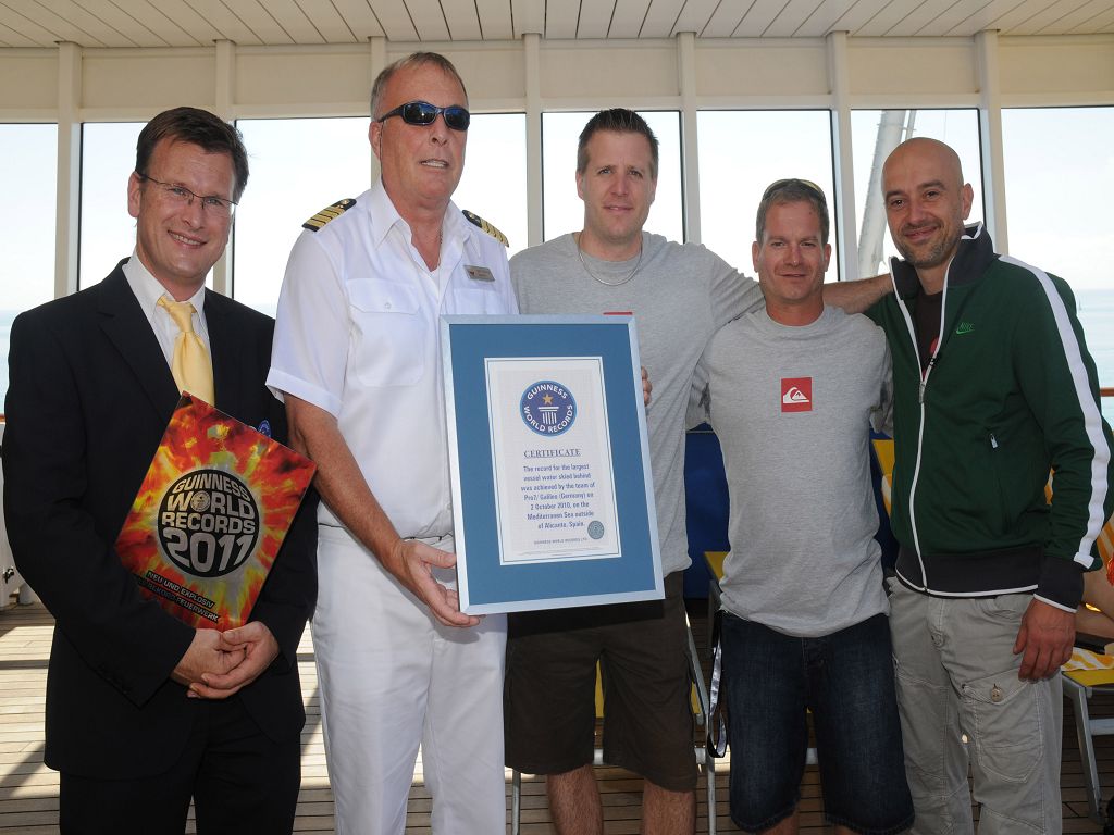 Der Weltrekord ereignete sich bereits am Samstag, 2. Oktober 2010, vor der spanischen Küste in der Bucht von Alicante. Am frühen Morgen bei strahlendem Sonnenschein und seichtem Seegang zog sich Jan Schwiderek, Reporter der TV Sendung "Galileo", bei einer Geschwindigkeit von 14 Knoten genau 6 Minuten und 25 Sekunden am Seil hinter AIDAbella her.
