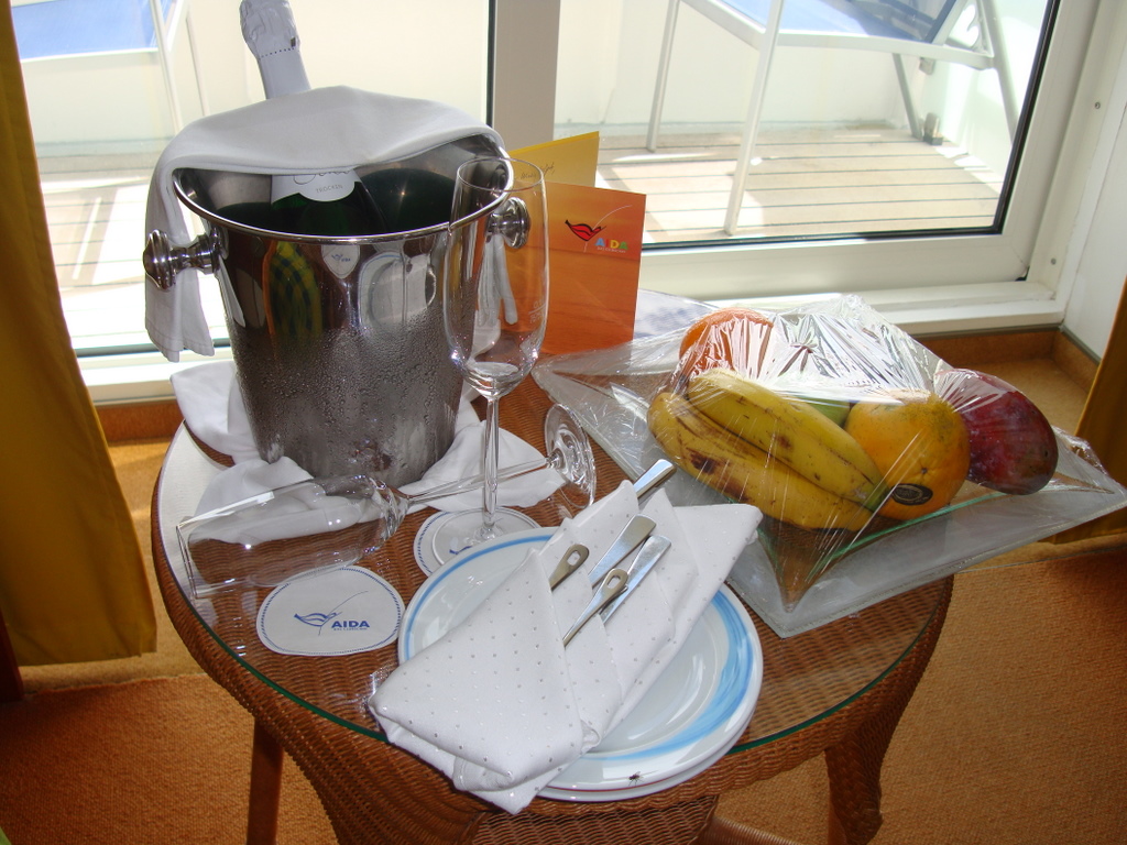 Am Abend stand auf meiner Kabine ein Flasche Sekt, eine Karte vom Clubdirektor und ein Obstteller für die guten Filme und Reiseberichte im Namen von "> Cruises auf dem Tisch.