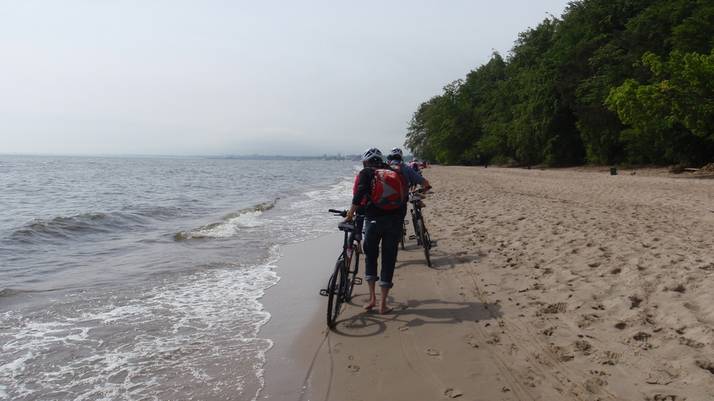 Am Vortag werden Helm undRucksack abgeholt. Für geübte Radsportler gibt es auch Klickpedale .Die Räder stehen dann schön aufgereiht vor der "> und nach einer Einweisung und kleiner Probefahrt geht es los. Aufgepasst, die Bremsen sind sehr gut !! Diese Tour eine Soft-Aktiv Tour von 35 km. Warum ? Ein fieser Hügel mit Spurrinnen und Matsch musste erklommen werden. Nur wenige blieben im Sattel. Schieben kein Problem, auf alle Teilnehmer wurde gewartet. Dann eine weitere Spaßeinlage barfuß schieben an der Bernsteinküste direkt an der See. Das Wasser war angenehm kühl. Weiter nach Zoppot dem ehemaligen
