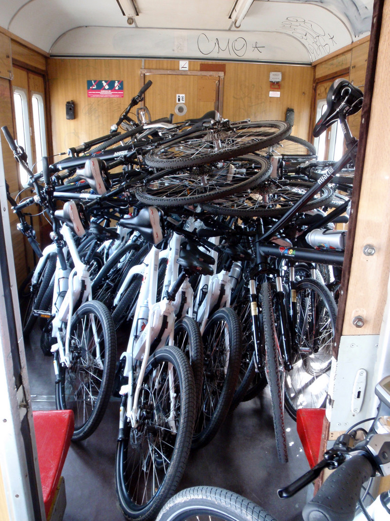 Nach dem Stadtbummel wieder am Treff, radelten alle Gruppen zum Bahnhof und fuhren auf den Schienen wieder zurück zum Schiff. Bei jeder Kreuzung und Ampel gut gesichert von unseren Radscouts. Nicht mit einer Draisine sondern mit einem Vorortzug ,der uns alle aufnahm. Die Räder wurden fachmännisch verstaut .