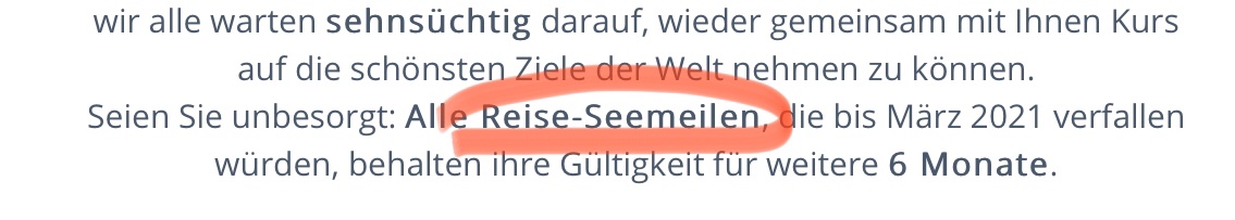 Beachte! Es sind die Reise-Seemeilen, die nicht verfallen. Die Start-Seemeilen verfallen wie üblich.