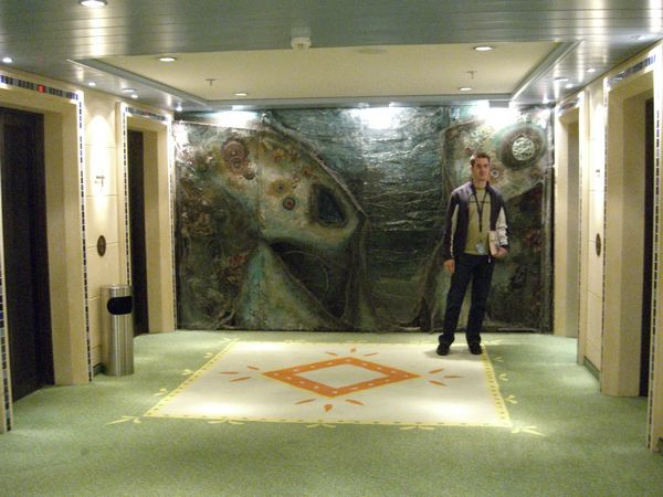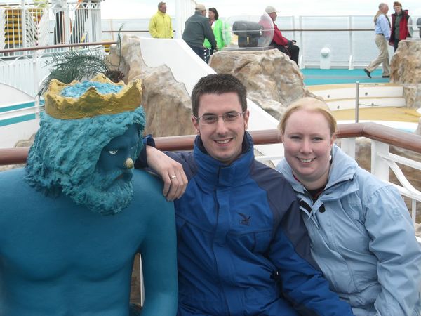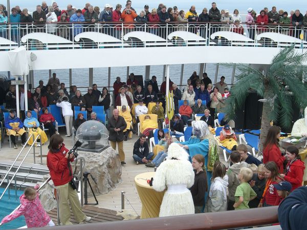 Heute war mal wieder Erholung auf See angesagt. Aber zu tun gibt es ja immer irgendwas…Unser Tag begann also wie immer mit dem Spätaufsteherfrühstück und im Anschluss daran sahen wir uns den Diavortrag des Bordlektors über Akureyri und den Norden Islands an. Der Vortrag war wie immer toll und danach war erst mal faulenzen angesagt bis etwa 17.00Uhr – denn da begann die Polartaufe. Beim Überfahren des Polarkreises, des in unserem Fall auf 66° 33′ 39″ (bzw. 66.56083°) nördlicher Breite gelegenen Breitenkreises, wurde Neptun mit dem Schiffstyphon an Bord gebeten und erschien auch glatt mit ein paar Gehilfen. Wer wollte, konnte sich nun in Neptuns Reich aufnehmen und taufen lassen. Ich hab natürlich mitgemacht. Bevor ich aber nun getauft werden konnte, musste ich wie alle anderen auch ein paar merkwürdige Sachen essen. Als erstes kam eine Gabel Seetang (oder Algen?) dran. Keine Ahnung was es genau war, aber es war grün, haarig, salzig kalt und schmeckte einfach widerlich. Zerkauen konnte man es auch kaum, da es im Mund immer mehr zu werden schien. Bäh! Angeblich war das Neptuns Haar…Die Herren vor und hinter mir amüsierten sich jedenfalls köstlich über das Gesicht, was ich während des Kauens zog. Naja, zum Glück gabs ein Glas von Neptuns Blut (Wein) zum Runterspülen. Dann folgten noch kalte Tagliatelle (Neptuns Bart) und man musste eine Fischflosse küssen. Das fanden die meisten wohl abschreckend, aber ich fands gegenüber dem Seetang echt harmlos. Da hätte ich lieber noch hundert stinkende Fischflossen geküsst ;o). Hatte man das nun alles überstanden, wurde man von Neptun getauft…ich erhielt den Beinamen Seehund. Ach ja, anzumerken wäre noch, dass Neptun mit der Stimme von Satan (dieses 1live Hörspiel- falls das jemand kennt- das zu den Werken des Kölner Duos Onkel Fisch zählt) sprach. Mich hat das zumindest sehr zum Lachen gebracht. Nach der Polartaufe war es dann schon fast Zeit für den Flitterwochen – Hochzeitstreff in der Nightfly Bar. Da wir am Montag in Bergen ja unseren 1. kirchlichen Hochzeitstag mit einem Abendessen im Rossini gefeiert hatten (Ich habe übrigens noch nie so gut gegessen…ein kulinarischer Traum!) und das unsere Hochzeitsreise war, haben wir natürlich daran teilgenommen. Alle Pärchen wurden von Klaus und Jo mit einem Glas Sekt begrüßt, es wurden Fotos gemacht und in Erfahrung gebracht, wer am längsten verheiratet war und wer am kürzesten. Es stellte sich heraus, dass nur 3 Paare frisch verheiratet waren, dann kamen wir mit einem Jahr und dann ging es erst ab 10 Jahren wieder weiter. Hier wurde mal wieder deutlich, dass doch mehr ältere als junge Leute an Bord waren…jedenfalls aus unserer Sicht ;o). Und wie sagte Klaus noch so schön: Er kenne das Geheimnis einer guten Ehe und wäre ja selbst schon über 30 Jahre verheiratet…das Geheimnis: Man(n) muß zur See fahren ;o)… Zum Abschluß wurde noch ein Foto mit allen Paaren im Theater gemacht, welches man dann auch ein paar Tage danach mit einem süßen Gruß in der Kabine liegen hatte. Wir haben danach den Abend dann ruhig ausklingen lassen, denn für den nächsten Tag und Akureyri hieß es früh aufstehen. Unser Ausflug sollte sich schon um 7.15 Uhr treffen… -