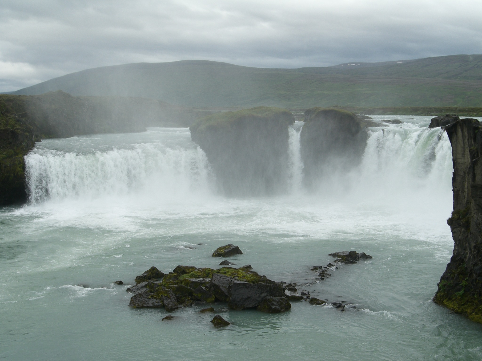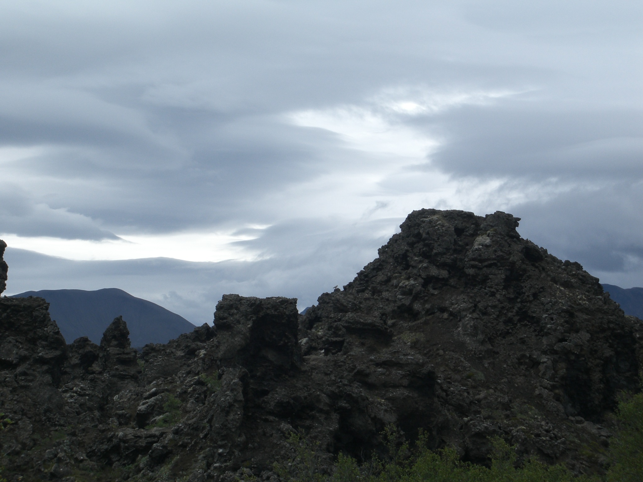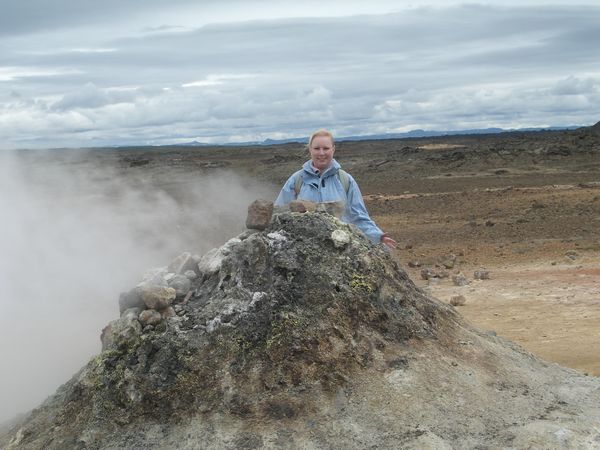 Unser Ausflug Godafoss und Myvatn begann schon sehr früh und um ca. 7.30 Uhr stolperten wir noch halbverschlafen vom Schiff in den Reisebus. Landschaftlich hatte Island natürlich wieder einiges zu bieten. Das Wetter war zwar nicht optimal - es war bewölkt - aber die Reiseleiterin betonte immer wieder, dass wir richtig Glück mit dem Wetter haben würden. Das stimmte sogar, denn es regnete zumindest nicht, während unseres ganzen Ausfluges. Unsere erste Station war der Godafoss Waserfall. Der Wasserfall der Götter, denn einer Sage nach sollen hier nach der beschlossenen Übernahme des Christentums als Staatsreligion die letzten heidnischen Götterbilder in den Go afoss geworfen worden sein. Die Gegend am Wasserfall lud vor allem zum Rumklettern ein, denn über viele Lavagesteinsbrocken konnte man munter über kleine Zuflüsse des Wasserfalls immer näher an ihn heran gelangen. Nach dem Stopp am Godafoss ging es weiter zum Myvatn, dem Mückensee, und den Pseudokratern von Skutustadir. Oh oh, Mücken…Ja, da hatten wir schon etwas Bammel vor, weil die Mücken dort zwar angeblich nicht stechen, aber überall reinkrabbeln wollen sprich in Ohren, Mund und Nase… Als wir aber am Mückensee ankamen und mit der Reiseleiterin eine kleine Wanderung durch/über die Pseudokrater machten, war von den Mücken nichts zu sehen. Puh, Glück gehabt! Scheinbar gefielen den Mücken die Witterungsverhältnisse nicht und wir hatten so (zum Glück) einen mückenfreien Blick auf den Mückensee. Die Pseudokrater waren sehr interessant, denn sie ähnelten kleinen Vulkanen. Entstanden waren sie aber dadurch, dass heiße Lava über ein Feuchtgebiet geströmt ist, wobei es sich um Sümpfe, aber auch um Seen oder Teiche handeln kann, und explosive Gase dabei freigesetzt wurden. Diese durchbrachen die Lavadecke und es entstanden kraterähnliche Formationen. Nach unserem Rundgang durch die Pseudokrater, konnten wir uns bei Kaffee und Kuchen (Achtung: Er hieß Mückenkuchen;).) stärken, bevor es weiter nach Dimmuborgir, also zu den „Dunklen Burgen“ ging. Nach dem Urlaub habe ich sogar eine relativ bekannte norwegische Metal-Band gefunden, die sich „Dimmu Borgir“ nennt… Da man sich zwischen den Lavaformationen wohl auch mal recht schnell verlaufen kann, haben wir als Gruppe mit der Reiseleiterin eine kleine Wanderung durch die „dunklen Burgen“ unternommen. Einer Sage nach sollen an diesem Ort mal Trolle eine große Party gefeiert haben (sicher so ne Art Troll Love-Parade) und wie das beim Feiern manchmal so ist, haben sie die Zeit vergessen und auch den Sonnenaufgang. So kam es dann dazu, dass dort jetzt massig versteinerte Trolle rumstehen. Ich habe wirklich in so gut wieder Lavaformation ein Gesicht, einen Troll oder andere gruselige Gestalten sehen können. Es ist also ein wundervoller und faszinierender Ort für Leute, die wie ich viel Fantasie besitzen. Ich bin z.B. heute noch davon überzeugt, dort einen versteinerten Verwandten von Jabba the Hut aus Star Wars entdeckt zu haben…;) Nach dem Ausflug in die „dunklen Burgen“ ging es weiter zu den brodelnden Schwefelquellen in einem Geothermalgebiet. Mannometer, da hat es vielleicht gestunken (Schwefel= Gestank von faulen Eiern). Da fühlte ich mich doch glatt in meine Zeit im Chemielabor während des Studiums zurückversetzt… Auf jeden Fall war es sehr faszinierend, wie da der heiße Schwefeldampf aus dem Boden zischte und die heißen Quellen vor sich hinbrodelten. Besonders interessant war auch, dass man die Thermalgebiete z.B. auch zum Brot backen nutzt. Der Teig wird in einer Eisentrommel für 24 Std. im Boden vergraben und wenn man ihn wieder nach oben holt, hat man ein fertiges und wohl sehr leckeres Brot. Mittlerweile war es für unseren Ausflug auch Zeit wieder zum Schiff zurückzukehren, da es bereits um 13.30 Uhr wieder alle Mann an Bord hieß. Da das Wetter etwas umschlug und es zu regnen begann auf der Rückfahrt, schafften wir es nicht ganz. Unser Bus war mit der letzte und erst um 13.45 Uhr wieder zurück im Hafen. Da hieß es dann für alle schnell einchecken und über die Funkgeräte konnten wir mithören, wie erleichtert verkündet wurde: Alle Ausflüge wieder an Bord! Irgendwie waren wir dann so müde nach dem Ausflug, dass wir in die Kabine gegangen sind und das Auslaufen und den ganzen Nachmittag verschlafen haben…aber das Wetter war ja eh nicht sooo toll …
